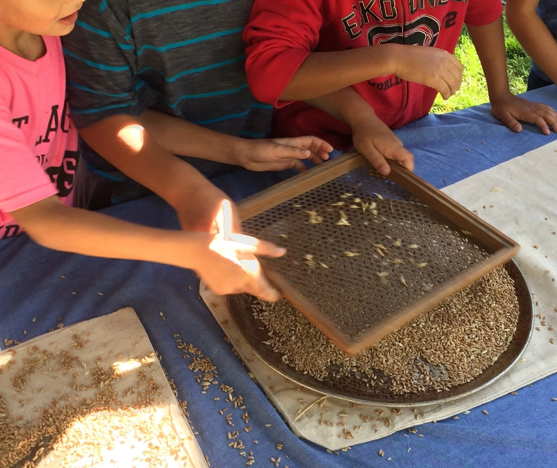 Kids winnowing grain with the aid of a grain screen, which can also help make winnowing easier.